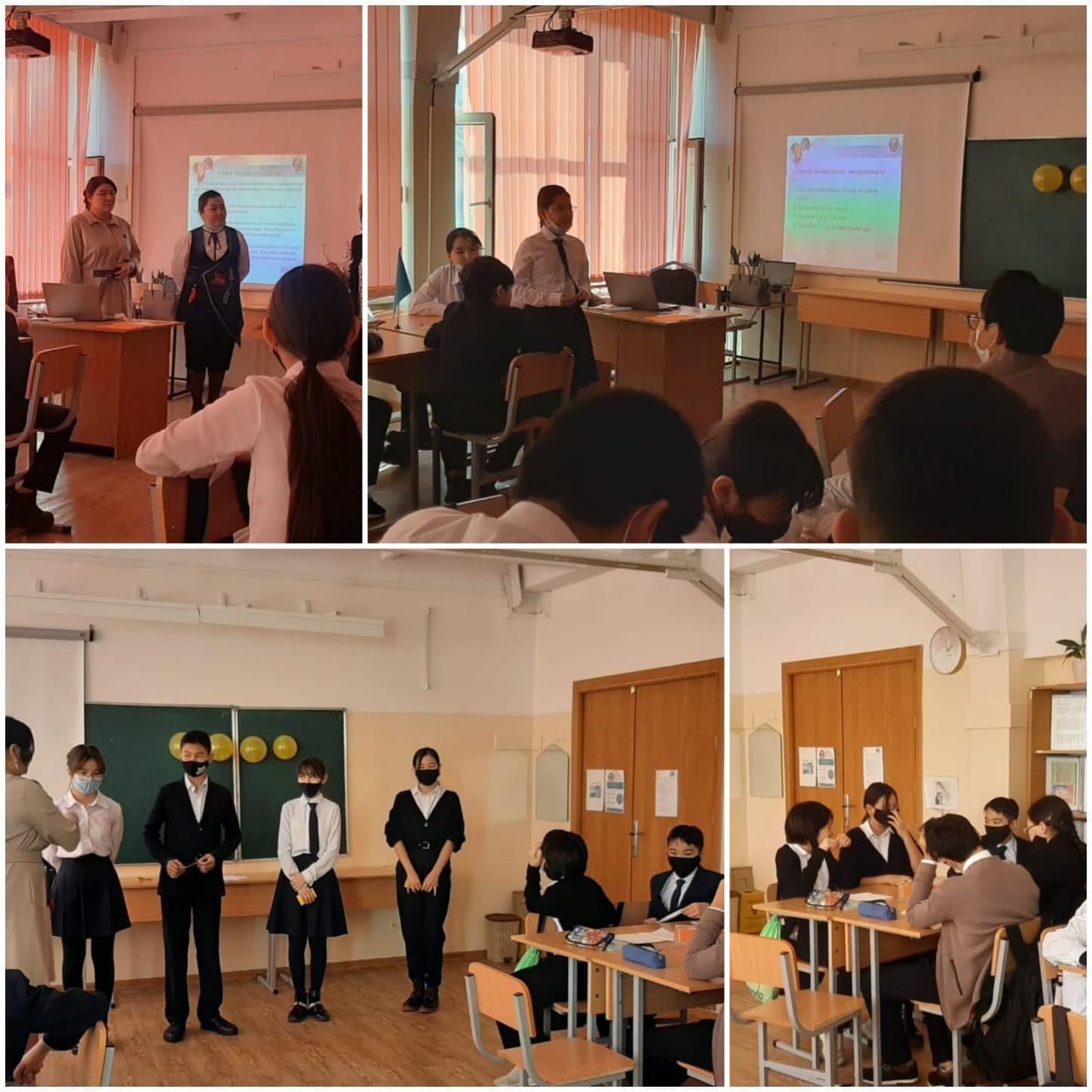 2021 жылдың 2 желтоқсан күні Қазақ тілі мен әдебиеті пәні әдістеме бірлестігінің "Тіл ұлттың тұғыры, рухы мен намысы" онкүндігі аясында қазақ тілі пәні мұғалімдері А.К Бейсекбаева және Ш.М Ермаханова 7 сынып оқушыларымен "Білім-жанып тұрған шырақ" тақырыбында сайыс сабақ өткізді.