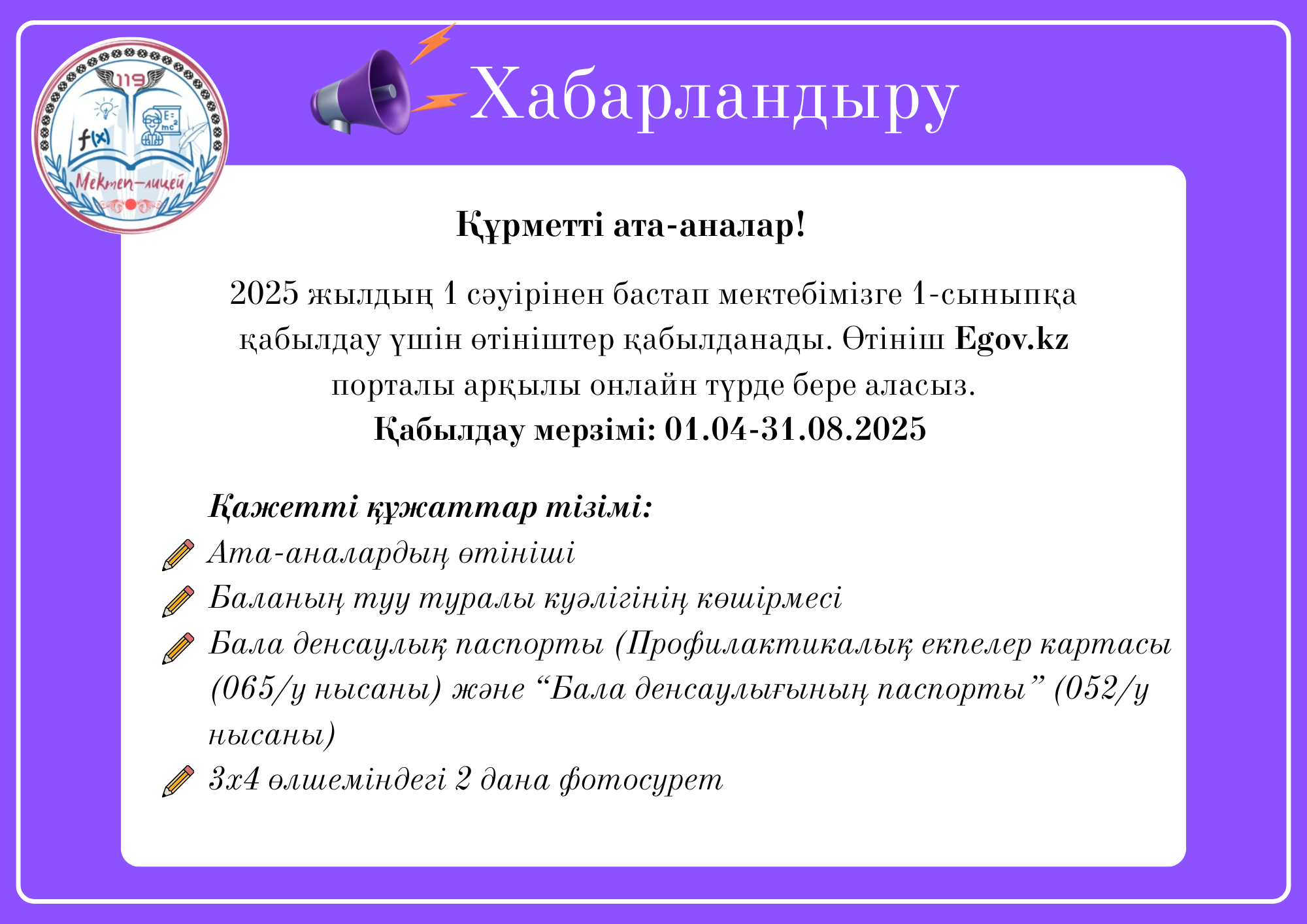 2025 жылдың 1 сәуірінен бастап мектебімізге 1-сыныпқа қабылдау үшін өтініштер қабылданады. Өтініш Egov.kz