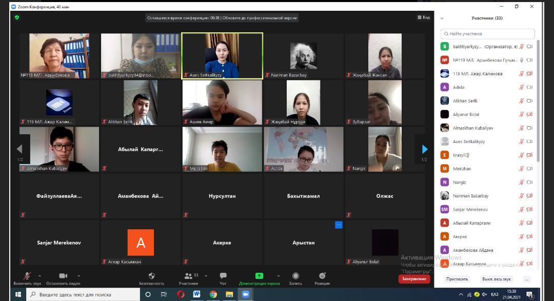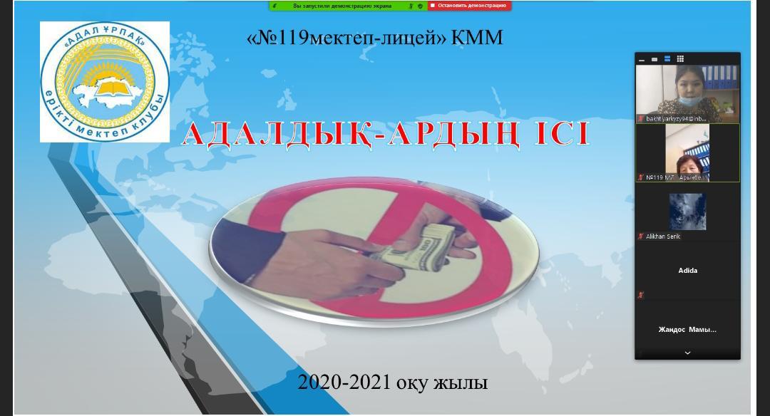 2021 жылдың 24 сәуір күні мектеп аға тәлімгері А.Б Бахтиярованың ұйымдастыруымен "Адал ұрпақ" ерікті мектеп клубы мүшелері және 9-10 сынып оқушыларымен сыбайлас жемқорлықты алдын алу мақсатында "Адалдық-ардың ісі" тақырыбында ZOOM платформасы арқылы сыныптан тыс іс шара өтті. Іс шара барысында оқушыларға адалдық жайлы бейнероликтер көрсетіліп, түсіндіру жұмыстары жүргізілді. Жиын соңында директордың тәрбие ісі жөніндегі орынбасары Г.А Арынбекова оқушыларды әділдікке, адал болуға шақырды.