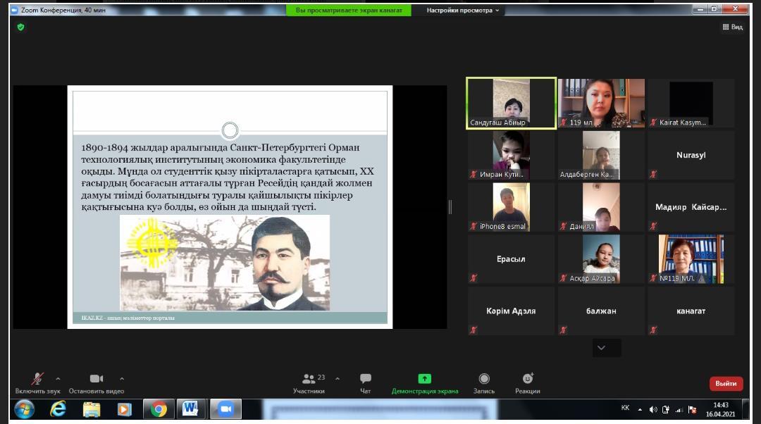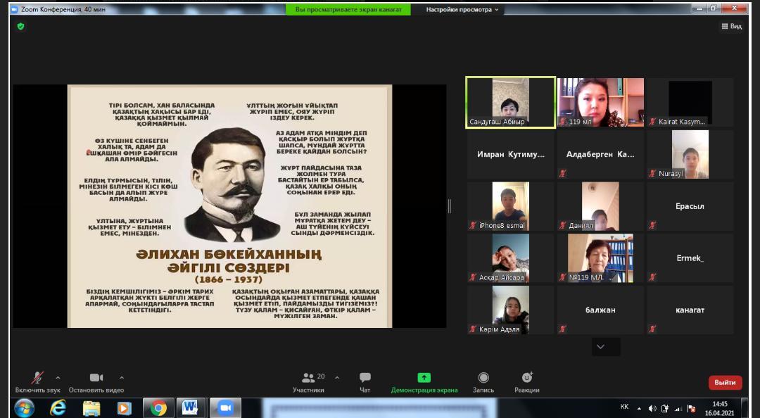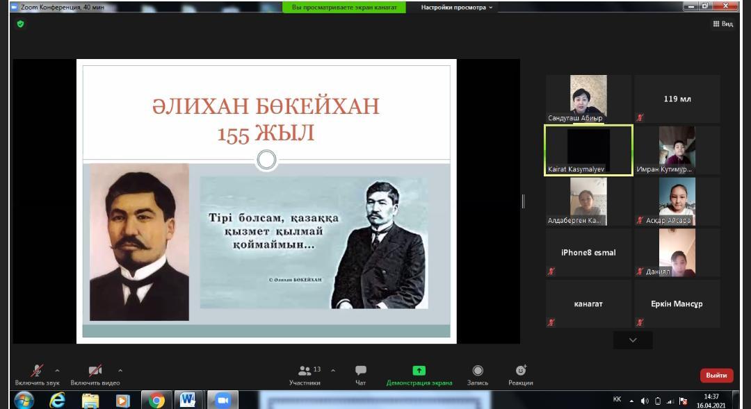2021 жылдың 16 сәуір күні Қазақстан Республикасы Тәуелсіздіктің 30 жылдығына орай тарих пәні мұғалімі С.Е.Абиыр Әлихан Бөкейханның 155 жылдығына байланысты сынып тәрбие сағатын өтті.